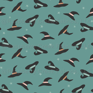 A fun Halloween tossed print of witches hats and stars in a Boho inspired colour palette of earth tone green, beige and soft peach