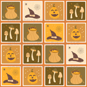 Halloween wizard cauldron, pumpkin and witch hat retro stamps quilted warm ornament