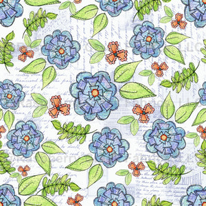 hand drawn blue and plum watercolor flower with red accent flower green leaves and word texture