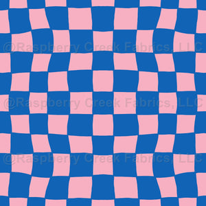 This modern royal blue and pink handmade checkerboard pattern has hand drawn checkered, check, or checked squares in a wavy grid.
