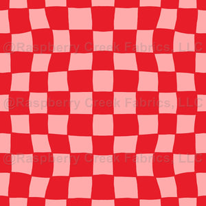 This modern pink and red checkerboard pattern has hand drawn checkered, check, or checked squares in a wavy and warped grid.