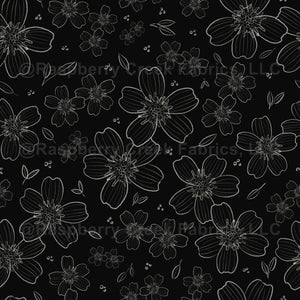 Line art style daisies and leaves on a black background. Hand drawn floral pattern