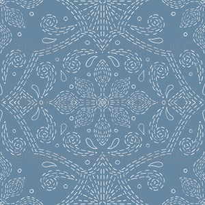 Hand-drawn Floral Damask Linework, White on Cornflower Blue, flowers, swirls, sun, bohemian, boho
