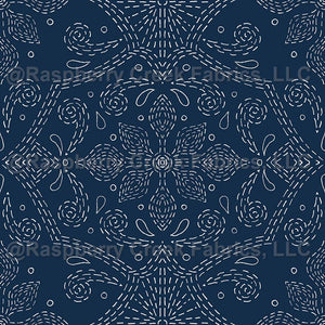 Hand-drawn Floral Damask Linework, White on Navy Blue, flowers, swirls, sun, bohemian, boho