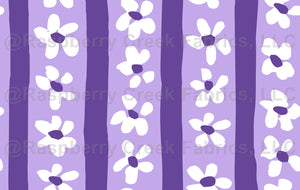 This design features lines of hand drawn little flowers and stripes in a purple and white color scheme. This would be cute for a quilt, dress or other projects.