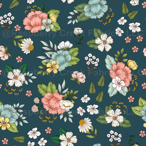 Hand Drawn Spring Floral, hand drawn daisies, peonies, little buds, leaves, flower clusters, and floral sprigs on a navy blue background.
