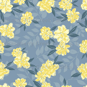 Hand drawn textured yellow magnolias in two yellow tones with lots of green-teal leaves on a lovely light blue color background.