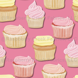 Hand painted cupcakes in various flavors and icing shapes with yellow, pink and peach icing on a bright pink background.