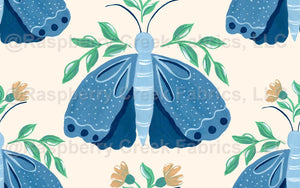 Hand painted gouache blue moths, butterflies and yellow flowers on a light neutral beige background