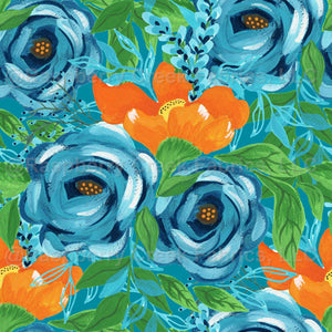 Vibrant floral pattern featuring bold blue roses, orange poppies, and lush green leaves. Perfect for eye-catching fabric, wallpaper, and home decor items.