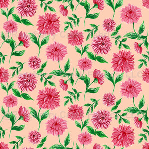 Hand painted pink and red painterly chrysanthemum flowers in a lush flower garden on a peach fuzz background