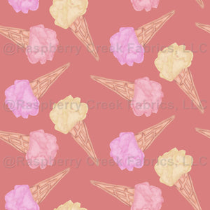 Hand painted, textured ice cream cones in vanilla, raspberry and strawberry ice cream colors on a dark peach background