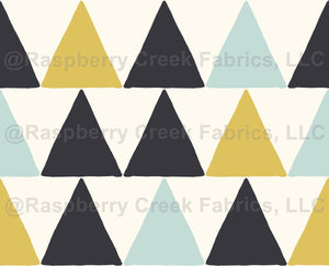 Blue aqua, yellow mustard and charcoal black triangles on white.