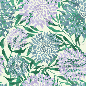 Hand painted watercolor blue and purple dahlias with lots of green leaves in this modern floral pattern