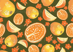 Handpainted gouache full oranges, orange slices, and orange wedges on an olive green color background.