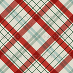 A festive multicolor diagonal plaid in red, green, aqua, and cream. This cheerful design captures the joyful spirit of the holidays and coordinates beautifully with the Happy Camper Christmas set. Ideal for quilts, pajamas, and cozy cabin apparel.