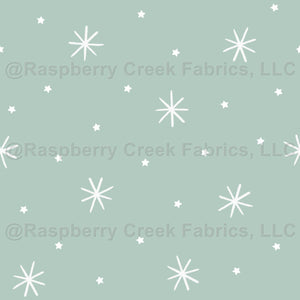 A soft powder blue background scattered with retro white snowflakes and stars. A whimsical winter coordinate for quilting, holiday crafts, or apparel. Designed to pair with the Happy Camper Christmas set for a snowy, vintage vibe.
