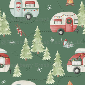 The heart of the Happy Camper Christmas collection, this hero pattern brings the whole scene to life. Vintage trailers decked in holiday lights, surrounded by snow-dusted trees and twinkling stars. A charming focal print that ties together all the coordinating designs in the set.
