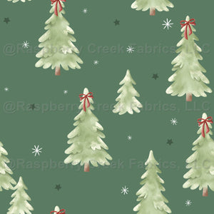 Classic evergreen trees dot a rich green background in this cozy woodland design. Pairs beautifully with the Happy Camper Christmas set for festive apparel, quilts, and holiday crafts.