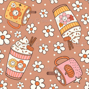 Happy Fall Y'All Pumpkin Spice Coffee Cups and Hot Chocolate Mugs on Caramel Coffee
