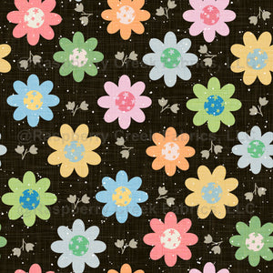 A fun rainbow colored floral pattern with bright daisies on a black background for good contrast.