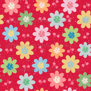 A fun rainbow colored floral pattern with bright daisies on a black background for good contrast.