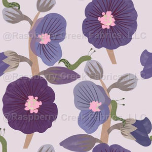 Haunted Hollyhocks - spooky hollyhock flowers in moody blues and purples with slugs - part of my 'in the witches garden' collection.