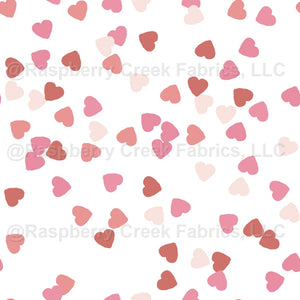 Pink, red, and cream heart-shaped confetti on an off-white background.