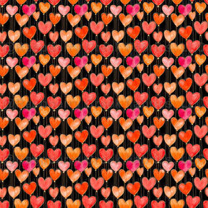 Bright heart-shaped balloons in pink, red, orange with gold outlines and strings on a black background.