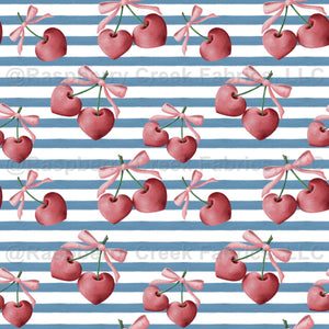 This whimsical heart-shaped cherry print was designed as a feature fabric for the Cherry on Top collection. Set against soft blue painted stripes, the cherries are tied with delicate pink bows for a playful, sweet look. The cheerful color palette of red, blush pink, blue, and cream creates a charming balance that feels both fun and timeless. Perfect for children’s clothing, dresses, pajamas, baby items, and statement quilt pieces, this seamless repeat brings personality and heart to any handmade project.
