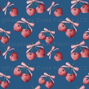 This heart-shaped cherry toss print was designed as a bold feature fabric for the Cherry on Top collection. Set against a rich navy blue background, the heart cherries are tied with soft pink bows for a playful, eye-catching contrast. The color palette of cherry red, blush pink, navy, and soft green gives this design a fun yet polished feel. Perfect for children’s clothing, dresses, pajamas, baby items, and statement quilt pieces, this seamless repeat adds charm and personality to any handmade project.