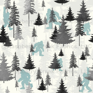 This fabric design features Bigfoot silhouettes in aqua, hidden among stylized evergreen trees in black and gray. The cool-toned palette creates a playful and mysterious feel, perfect for children's decor, quirky apparel, or unique accessories.