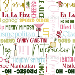 This festive holiday cocktails typographical pattern features playful drink names arranged in a seamless, easy-to-sew layout. Perfect for adding a cheerful, party-ready touch to your handmade makes! Ideal for pajamas, aprons, quilts, table runners, tote bags, kitchen textiles, holiday apparel, gift sewing, and more. The clean, graphic lettering style keeps this design fun, modern, and totally wearable throughout the season. A joyful print for celebrations, gatherings, and gift giving!