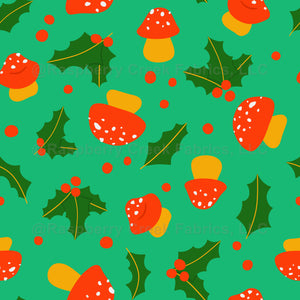 Christmas mushroom small scale tossed print in a vibrant green, red and yellow color palette. More colorways available in my shop!