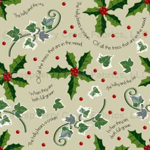 Inspired by the traditional old English Christmas carol about the holly and the ivy, this design features glossy sprigs of holly and tendrils of variegated ivy on a heavy cream background with a scattering of red berries.