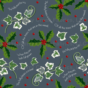 Inspired by the traditional old English Christmas carol about the holly and the ivy, this design features glossy sprigs of holly and tendrils of variegated ivy on dark holly green with a scattering of red berries.