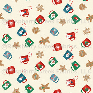 Nondirectional whimsical hot cocoa mugs and gingerbread cookies on cream, faux paper texture. Part of the Cozy Christmas Collection.