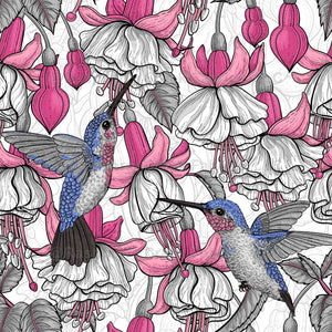 Vector seamless pattern with hand drawn fuchsia flowers and hummingbirds