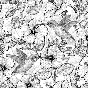 Seamless pattern with hand drawn hummingbirds and hibiscus flowers