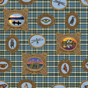 Create the look of an elegant hunting lodge with the pattern featuring sage plaid, framed artwork of mountains, lakes, dogs, butterflies, and duck hunting.