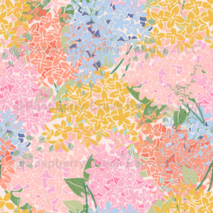 A luscious pattern with big bushy hydrangeas in spring summer colors. Perfect for floral interiors and flower lovers.
