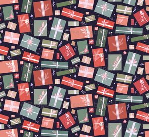 Hygge pattern with gifts and floral decorations on dark background. Holiday packages