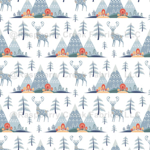 A serene woodland pattern featuring deer, mountains, and winter trees in cool pastel tones, perfect for an enchanted forest theme. Commercial use okay.