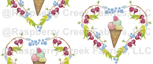 A soft watercolor pattern featuring a heart-shaped arrangement of bleeding heart flowers and delicate forget-me-nots. At the center of the floral heart sits a charming ice cream cone, adding a sweet, playful twist to the romantic botanical theme. Ideal for summery fabric projects such as dresses and children’s clothing. This design combines vintage floral elegance with a touch of lighthearted nostalgia.