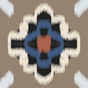 Abstract autumnal Ikat medallions and crosses in amaro, black mountain, blue ridge, panna cotta and eggshel on morel brown.