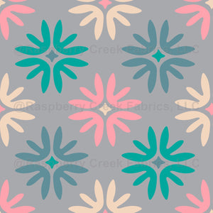 Abstract florals in a geometric tile grid layout in Pink, Blue, Aqua Turquoise and Cream on Cool Gray! This design is available in other colourways too!