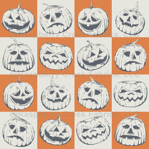 Hand-drawn Halloween pumpkins in a checkerboard repeat. Designed to resemble a linocut technique. Vintage orange and medium gray.
