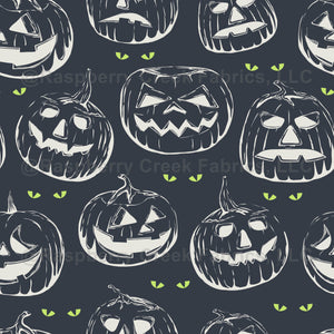 Hand-drawn Halloween pumpkins with cat eyes peering from the dark. Designed to resemble a linocut technique. Vintage color palette in charcoal gray.