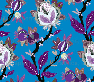 A vibrant Jacobean style floral pattern, with details often found in crewel embroidery popular in that era. Rich purple tones on a vibrant blue coloured background.