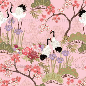 Japanese Garden with dancing red capped cranes, irises, cherry blossoms and pines on a pink background.